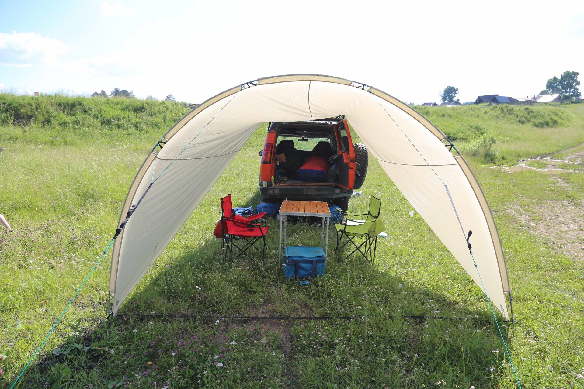 - Первый вариант установки: Тент имеет одну дугу, которая крепится оттяжками к земле. Противоположный край тента крепится к багажнику автомобиля. Под навесом можно расставить кемпинговую мебель