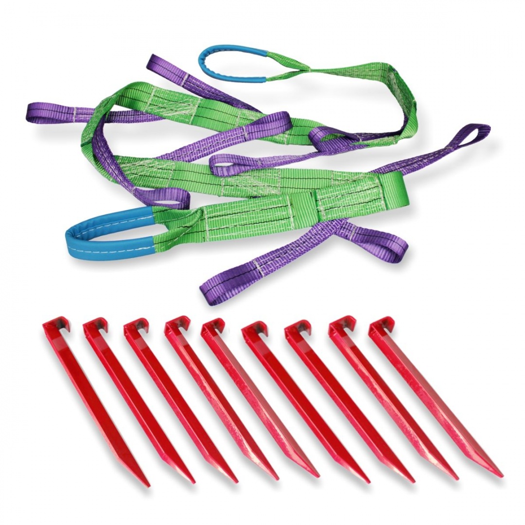 Данное изделие длиной 2.5 метра изготовлено из прочной на разрыв полиэстеровой ленты, имеет две петли с защитой из экокожи и девять петель, которые крепятся кольями к грунту.