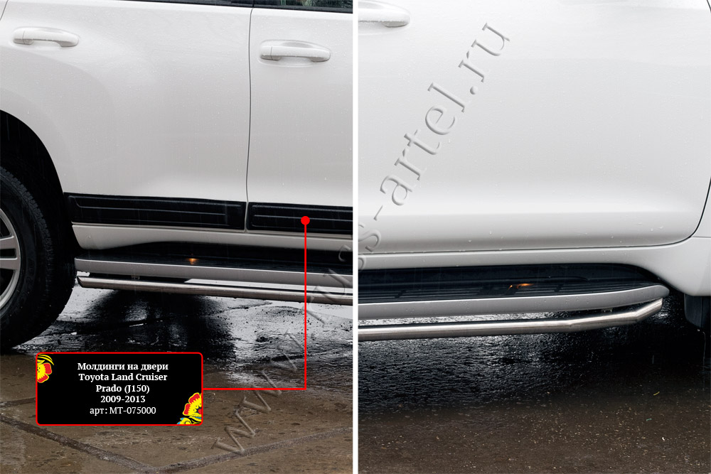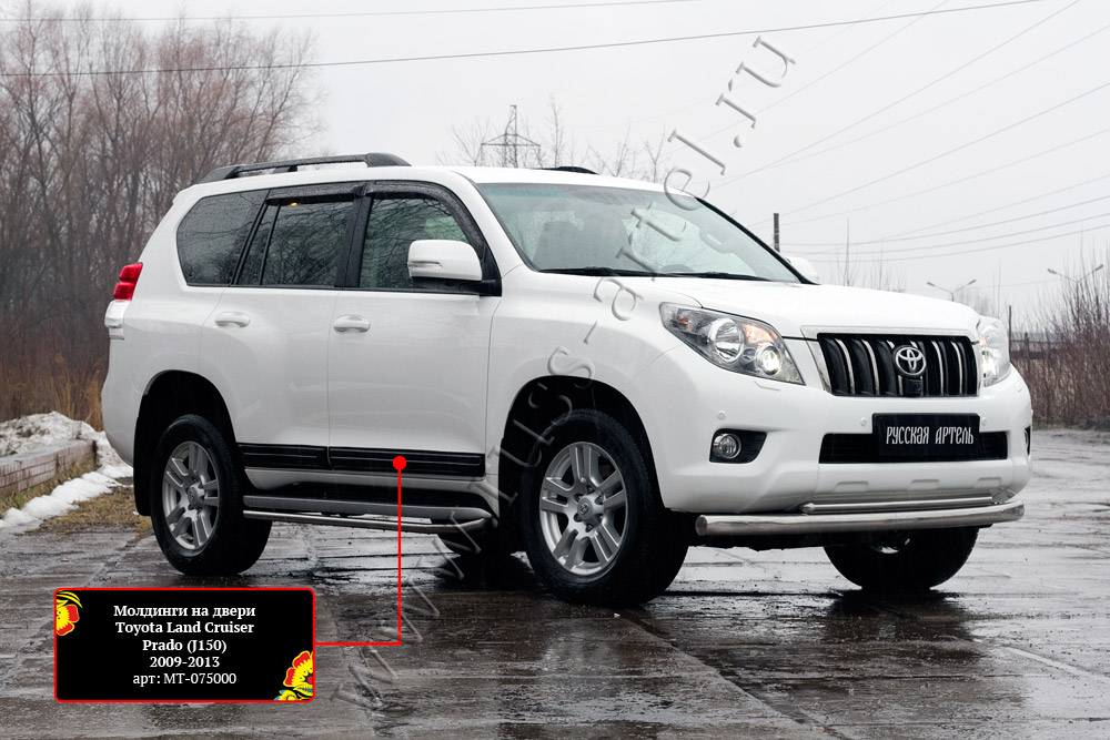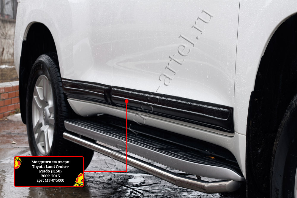 Молдинги предназначены для улучшения внешнего вида авто и защиты лакокрасочного покрытия от некоторых внешних воздействий.Молдинги дверей устанавливаются при помощи 3М скотча. Подходит на автомобиль Toyota Land Cruiser Prado (J150) 2009-2013 и Toyota LC Prado 150 рестайлинг 2013-н.в.