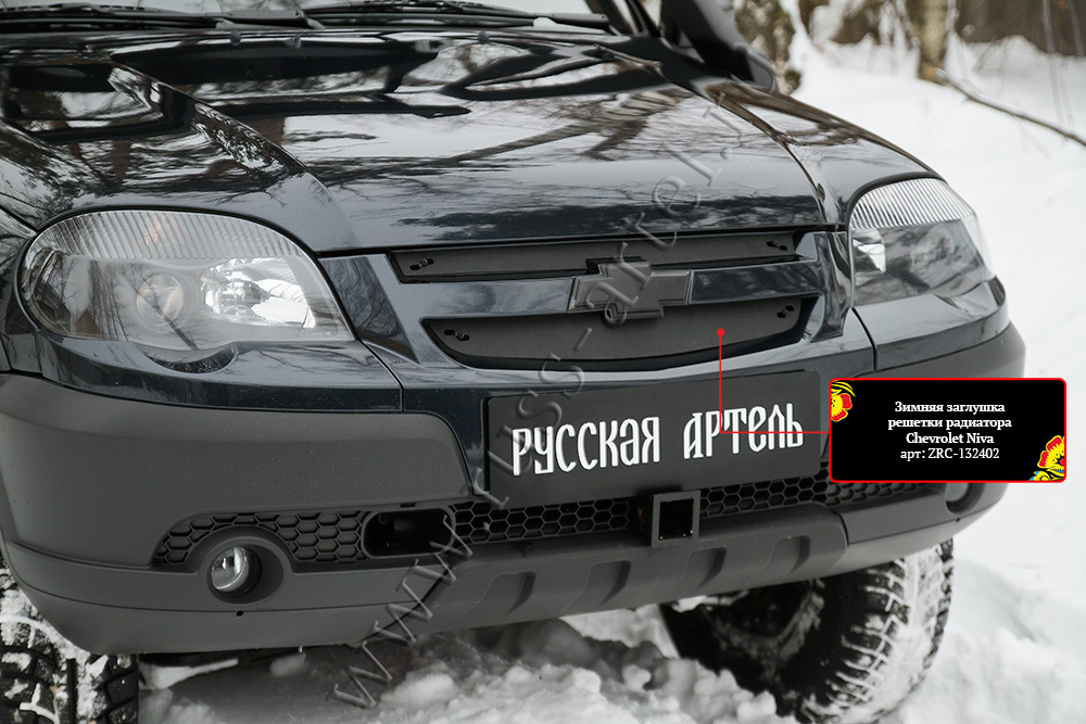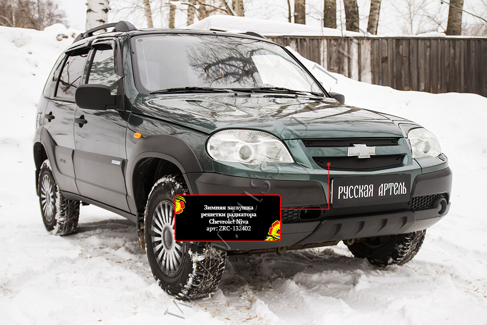 Заглушка решетки радиатора сокращает поток холодного воздуха, поступающего в моторный отсек, а также помогает сохранить тепло. Не допускает попадание грязи, пыли, камней и кусков льда в радиатор, тем самым защищая его от загрязнения и повреждения. Подходит на автомобиль Chevrolet Niva 2009-н.в.