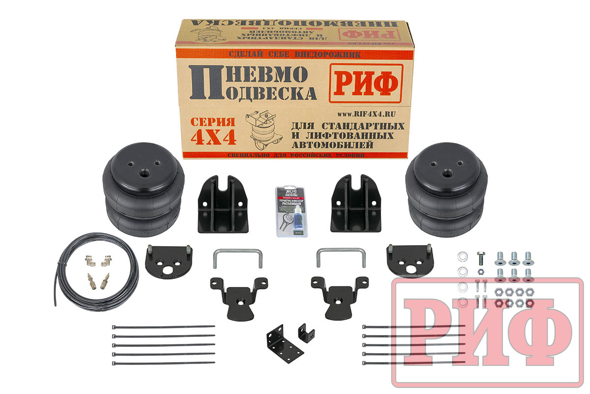 Комплект пневмоподвески РИФ устанавливается в дополнение к штатной подвеске автомобиля и позволяет снизить нагрузку на рессоры и использовать полную грузоподъёмность автомобиля без изменения геометрической проходимости.