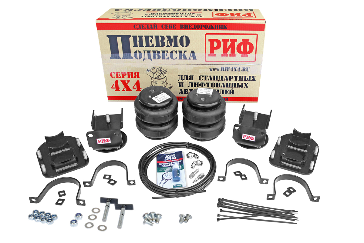 Комплект пневмоподвески РИФ устанавливается в дополнение к штатной подвеске автомобиля и позволяет снизить нагрузку на рессоры и использовать полную грузоподъёмность автомобиля без изменения геометрической проходимости.