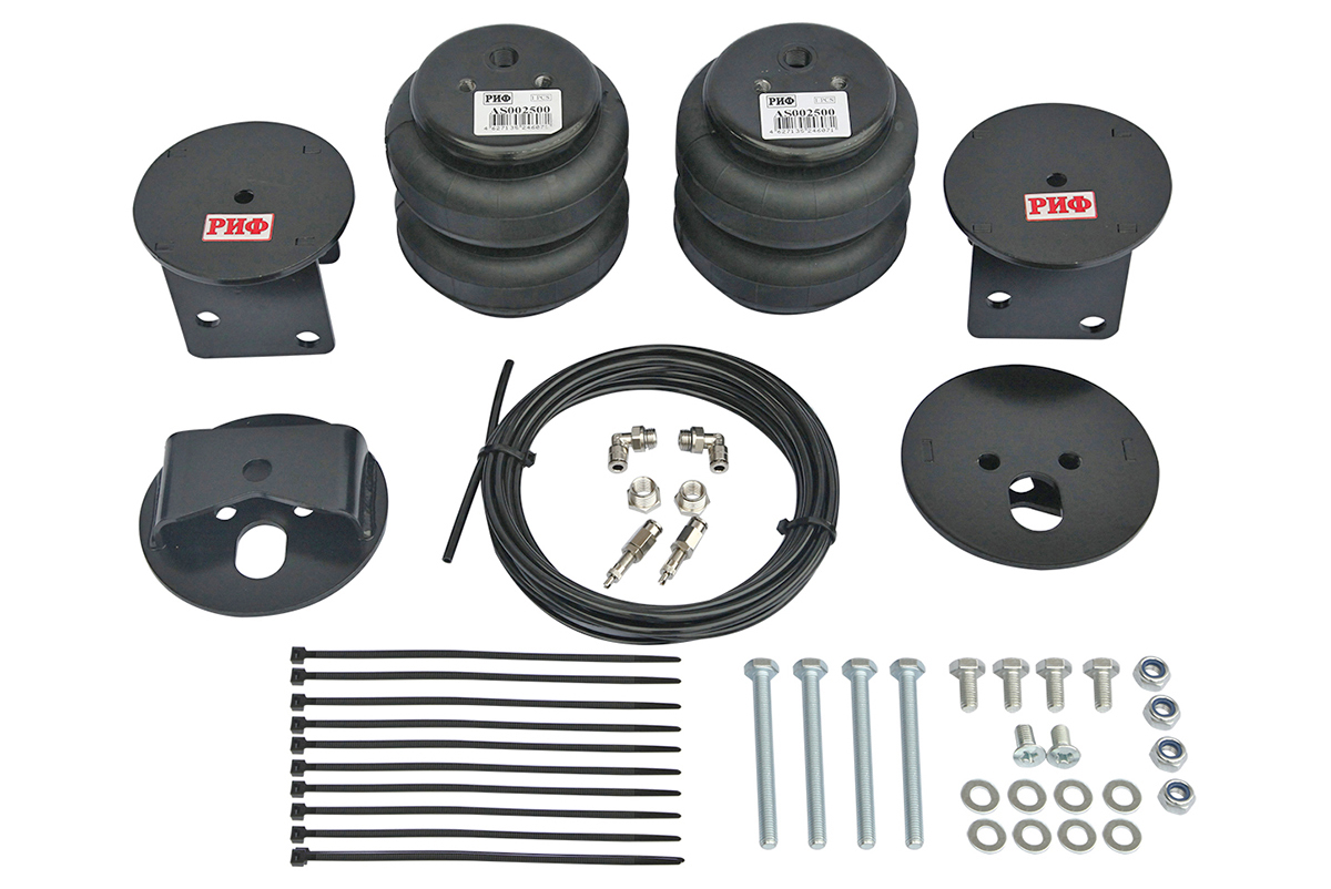 Комплект пневмоподвески РИФ устанавливается в дополнение к штатной подвеске автомобиля и позволяет снизить нагрузку на рессоры и использовать полную грузоподъёмность автомобиля без изменения геометрической проходимости.
