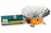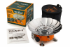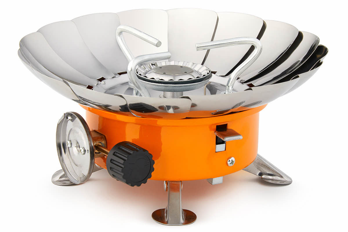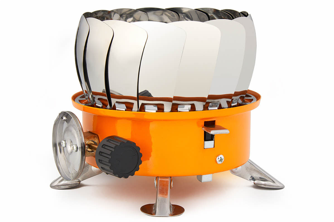 Плита снабжена специальным механизмом в виде раскладывающихся «лепестков» из нержавеющей стали, предохраняющих пламя от задувания ветром во время приготовления пищи.