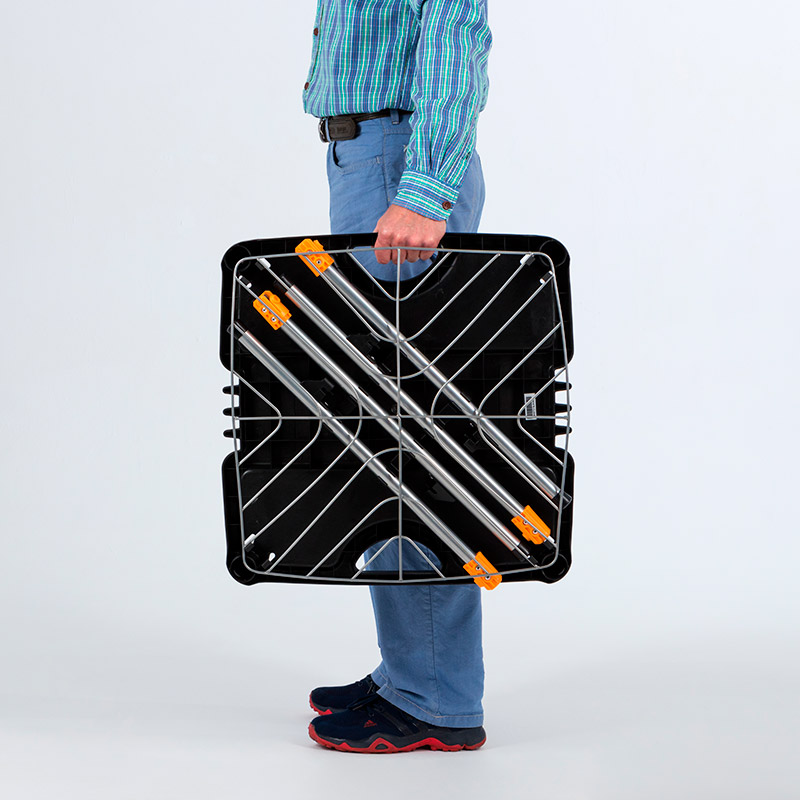 Прочная пластиковая столешница с выемками для ножек гриля. В столешницу надежно монтируются легкие прочные ножки стола, которые надежно фиксируются стопорными кнопками.