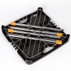 В нижней части стола быстро и надежно крепится дополнительная легкая и прочная сетчатая полка.