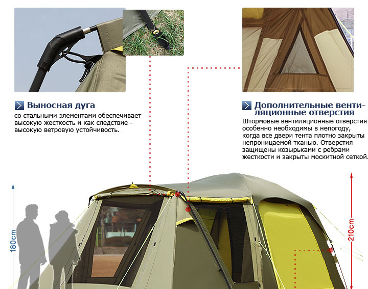 И входы и окна внутренней палатки оснащены противомоскитными сетками и ветрозащитными шторками. На боковых стенках внешнего тента имеется два окна во всю стенку, которые также имеют противомоскитные сетки и ветро/водозащитные стенки.