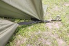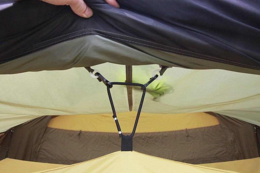 После того, как вы установили сам тент подвесьте внутреннюю палатку и расшпильте ее дно в землю.