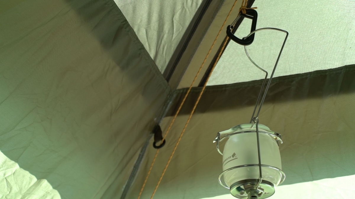 Для того, чтобы наладить освещение шатра вечером, предусмотрена система из закольцованного шнура с закрепленным на нем карабином. Вам достаточно пристегнуть к карабину лампу или фонарь, поднять его под купол и зафиксировать шнур.