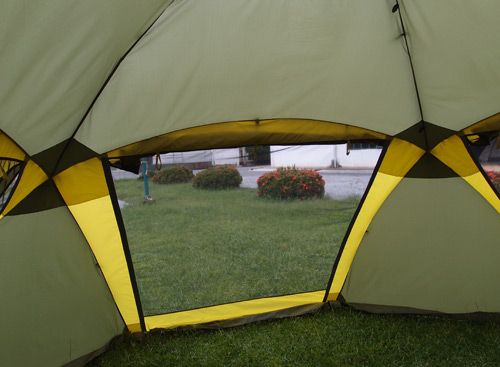 Конфигурация пола шатра представляет собой восьмиугольник. Шатер имеет четыре больших входа-двери. Каждая из них закрывается противомоскитной сеткой и дублируется ветро/водозащитными стенками.