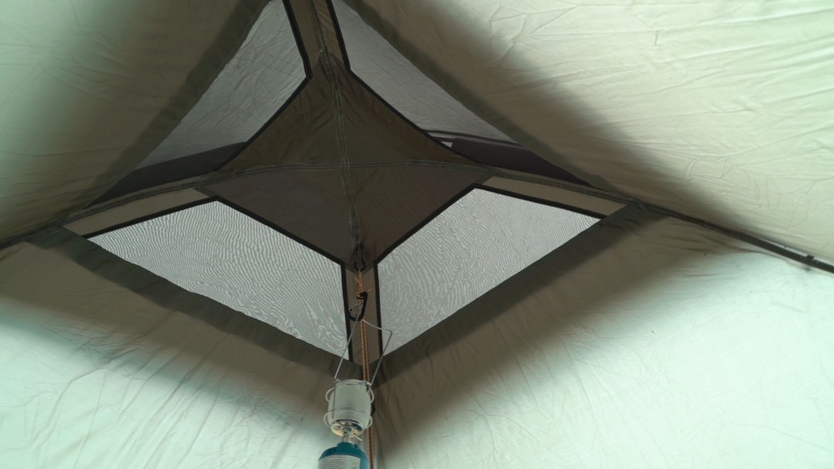 В куполе шатра для улучшения вентиляции четыре вентиляционных отверстия, защищенных противомоскитными сетками. Сверху вентиляционных отверстий - защитный фартук, предотвращающий попадание воды через эти отверстия во время дождя.