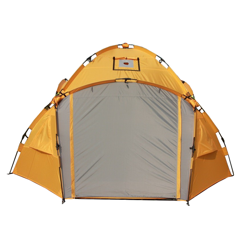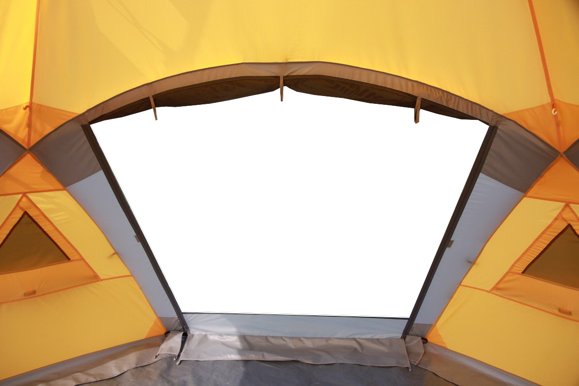 Шатер имеет четыре больших входа-двери. Каждая из них закрывается противомоскитной сеткой и дублируется ветро/водозащитными стенками. Для улучшения вентиляции в летнее время между каждым входом есть четыре достаточно больших треугольных вентиляционных окна.