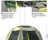 Накиньте тент на крышу шатра и зафиксируйте эти застежки на основных дугах каркаса под быстросборным механизмом дуг. Закрепите тент по четырем верхним углам к каркасу шатра при помощи липучек. Перейдите к противоположной стороне. Возьмите дугу из фибергласа, соберите ее и вставьте в верхний рукав тент-хауса. Вставьте концы дуги в пластиковые коннекторы, которые пришиты по краям рукава. Соберите стальные стойки, состоящие из трех секций каждая Верхний конец каждой стойки вставьте в свободное отверстие пластикового коннектора и зафиксируйте нижние концы стоек. Пристегните тент к вертикальным стальным стойкам при помощи пластиковых защелок. Расшпильте тент-хаус при помощи стальных шпилек и установите ветровые растяжки.