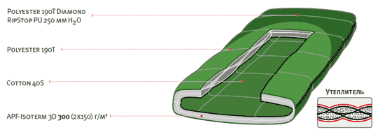 Нижняя часть спальника и область ног (более темного цвета) сшита из не продуваемой, влагозащитной и прочной ткани, усиленной плетением RipStop (ткань усилена толстой и прочной нитью в горизонтальном и вертикальном направлении с шагом в 2 мм). С внешней стороны материал обработан пропиткой WR (water repellent), а с внутренней стороны покрыт слоем полиуретана с водонепроницаемостью 250 мм водного столба. Центральная часть спальника (светлая ткань) сделана из паропроницаемой ткани,что позволяет спальнику "дышать", выпускать пар и не конденсировать влагу внутри. Следующим слоем после ткани идет синтетический утеплитель APF Isoterm 3D - вспушенное волокно с воздушными каналами и силиконовым покрытием для уменьшения сваливания волокон и предотвращения впитывания влаги. Двухслойный утеплитель сформирован в пакеты, смещенные относительно друг друга на половину ширины пакета, что позволяет значительно сократить потери тепла через швы. Если вам холодно, затяните шнуры затяжки вокруг плеч, и тепло не покинет вас.